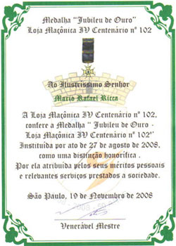 – Dr. Mário Rafael Ricca recebeu o diploma Honra ao Mérito do Governo do Estado de São Paulo – Secretaria da Segurança Pública – Coordenadoria Estadual dos CONSEGs em 16/06/2010.
